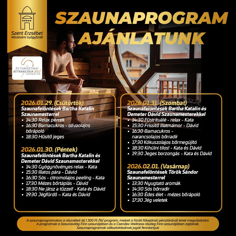 A rendszeres szauna programok keretében a vendégek kényeztetéséről és a professzionális szaunázásról képzett szaunamesterek gondoskodnak.