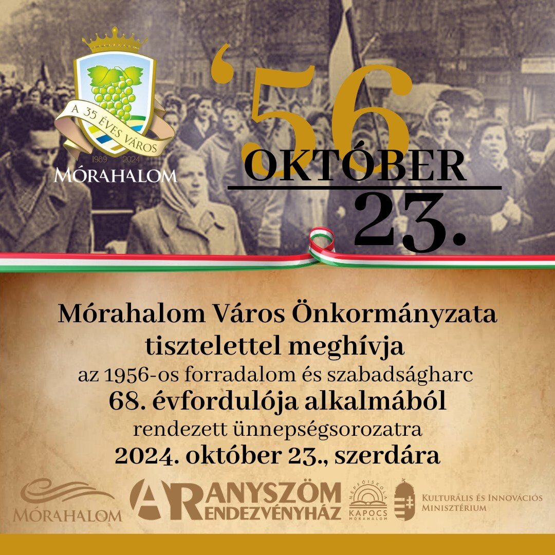 Mórahalom Város Önkormányzata szeretettel meghív mindenkit az 1956-os forradalom és szabadságharc 68. évfordulójára szervezett megemlékezésre, mely 2024. október 23-án, szerdán kerül megrendezésre.
