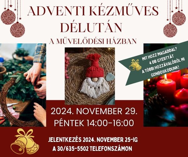 Idén megrendezésre kerül az adventi kézműves délutan Ruzsán, a Művelődési Házban.