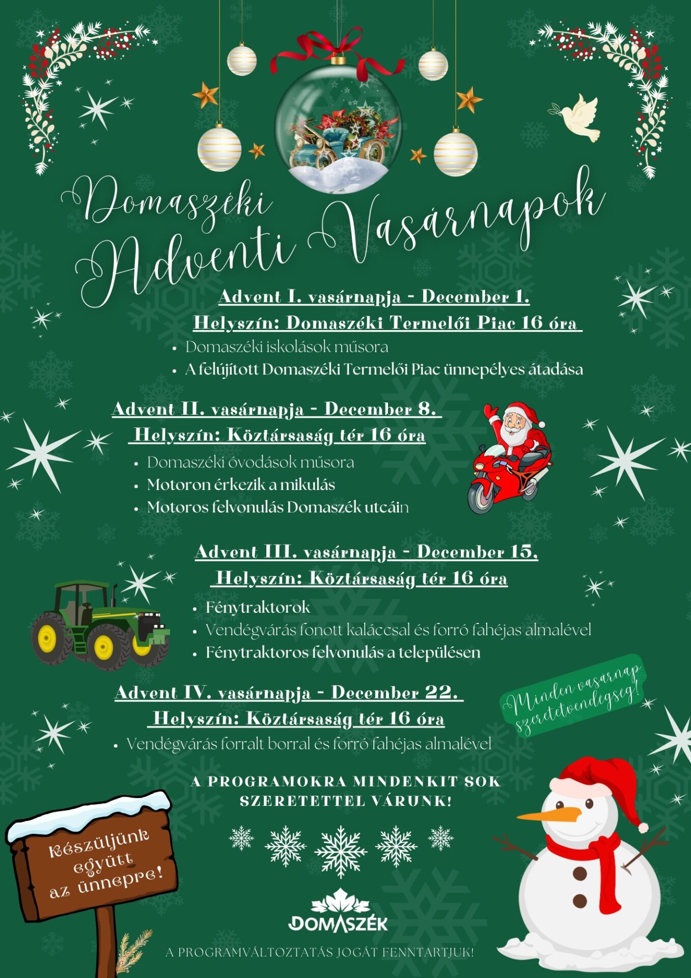 Az idei évben is mindenkit sok szeretettel vár Domaszék közössége, a helyi civil szervezetek és az önkormányzat az adventi vasárnapokon megrendezésre kerülő ünnepségsorozatra!