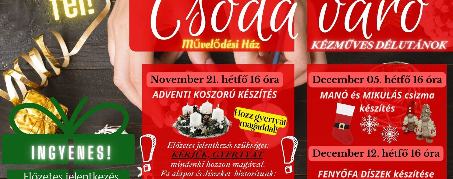 Szeretettel várunk mindenkit hétfőnként a CSODA VÁRÓ ÜNNEPI KÉZMŰVES foglalkozásainkra.