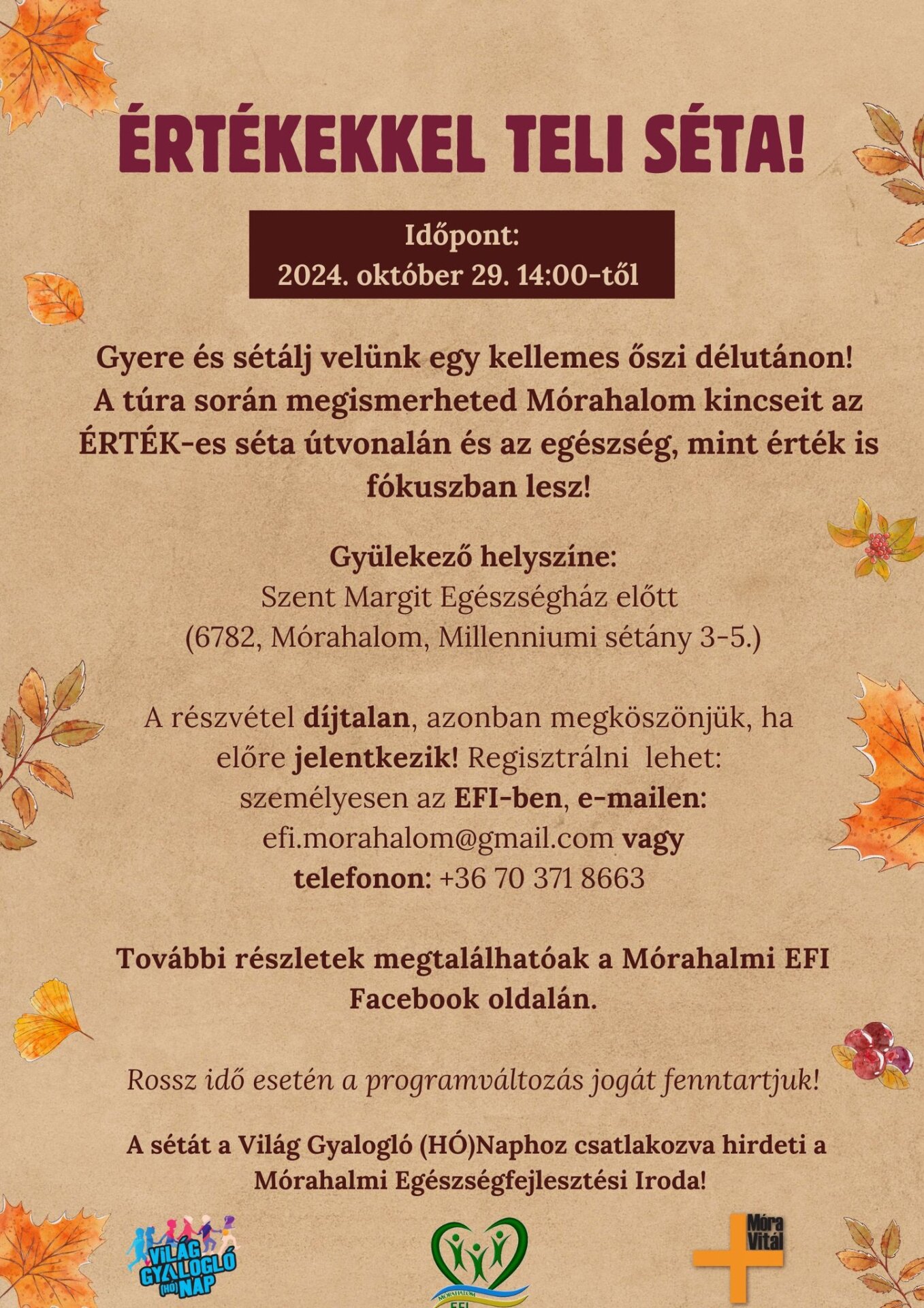 A Magyar Szabadidősport Szövetség idén is meghirdette a Világ Gyalogló(HÓ)Nap (World Walking Day) hazai rendezvénysorozatát, amely egész októberben Magyarország területén zajlik. A programsorozat célja a gyaloglás népszerűsítése, melyhez idén a Mórahalmi Egészségfejlesztési Iroda is csatlakozik!