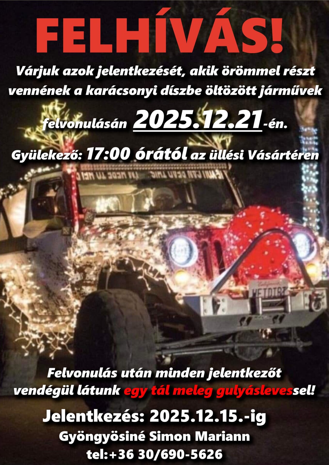 Várjuk azoknak a jelentkezését akik szívesen részt vesznek a karácsonyi díszbe öltözött járművek felvonulásán 2025.12.21-én!