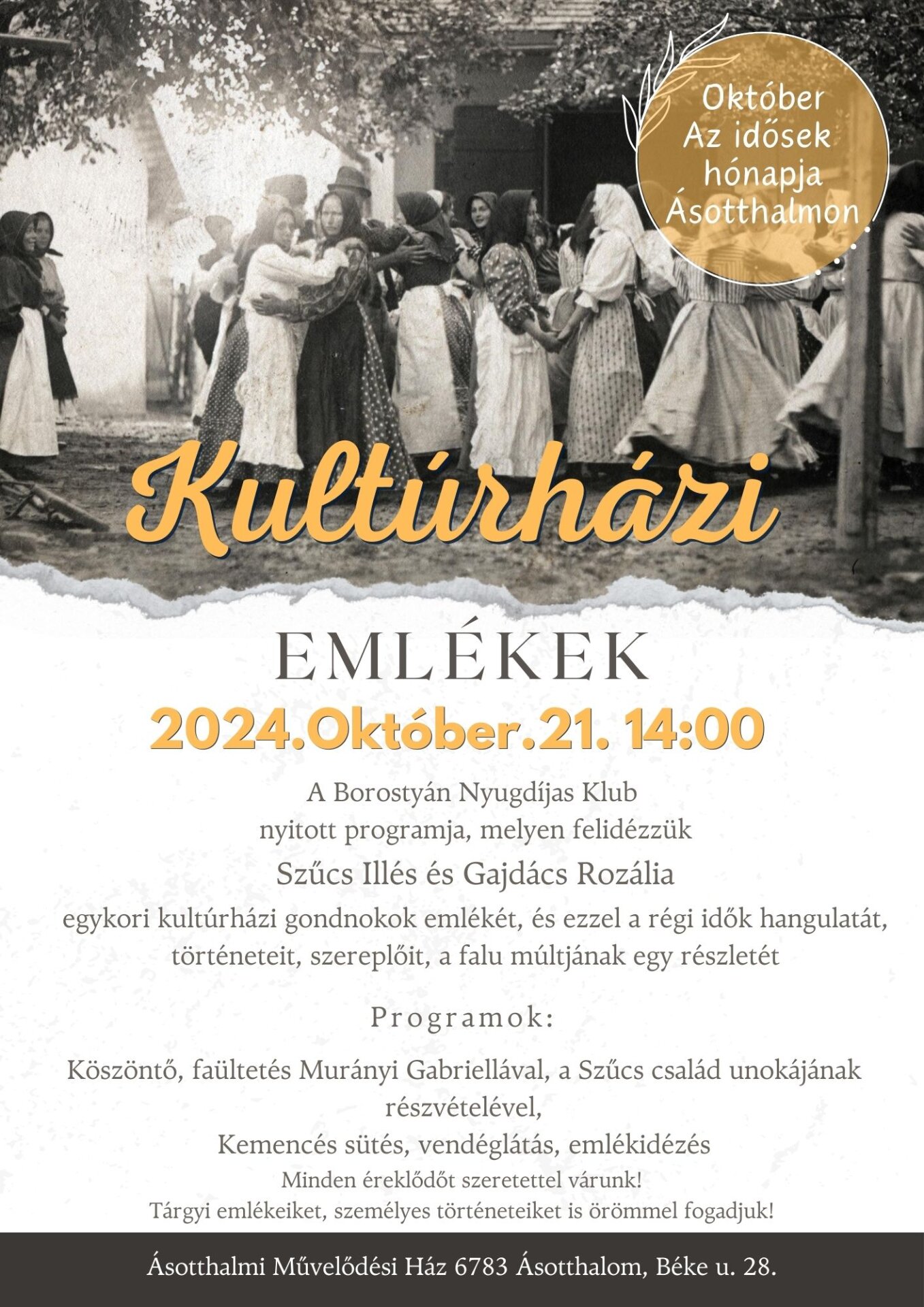Szeretettel várunk minden érdeklődőt egy múltidéző délutánra a Művelődési házba 2024.10.21.-én 14:00-kor.