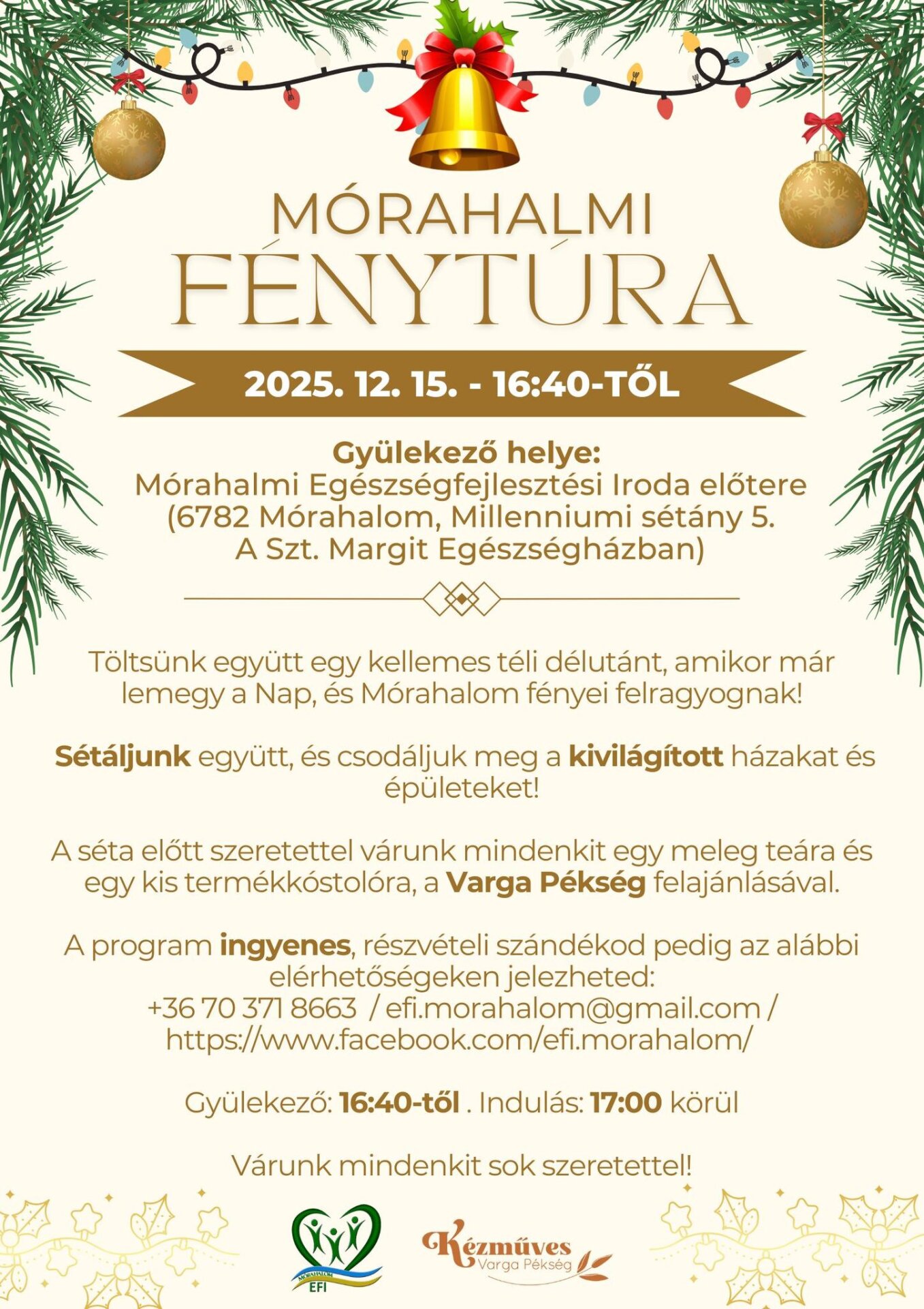 A Mórahalmi Egészségfejlesztési Iroda idén is megszervezi a “Fénytúrát”, ahol együtt nézzük meg Mórahalom ünnepi fényeit.