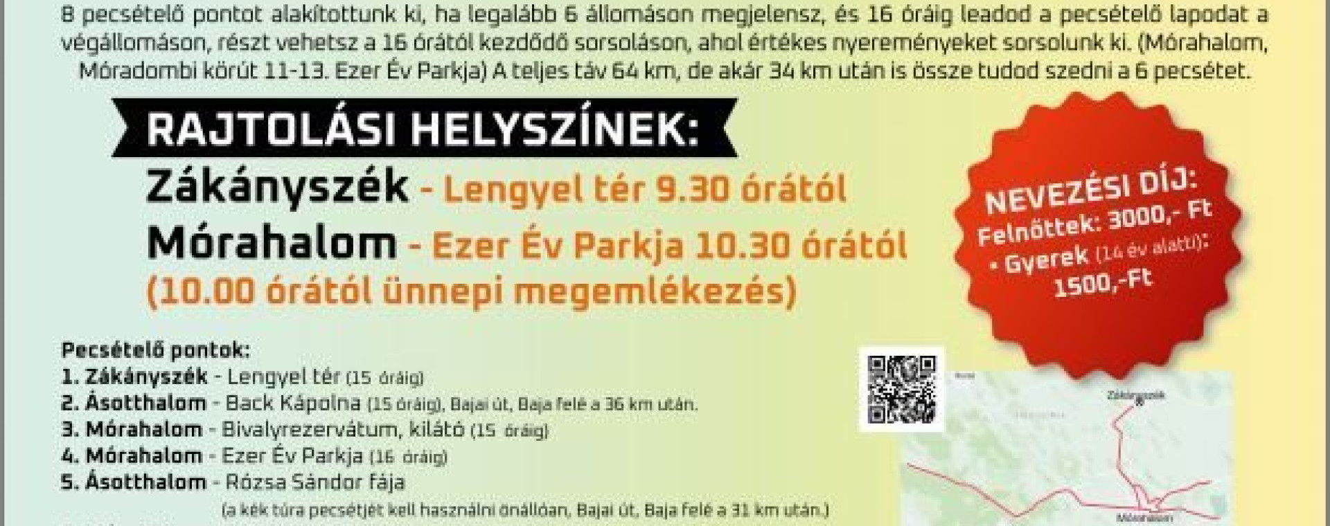 A távot Te határozod meg, saját erőnléteknek megfelelően! 8 pecsételő pontot alakítottunk ki, a túra akkor minősül teljesítettnek, ha legalább 6 állomáson megjelensz, és 16 óráig leadod a pecsételő lapodat végállomáson. (Mórahalom, Móradombi körút 11-13. Ezer Év Parkja)