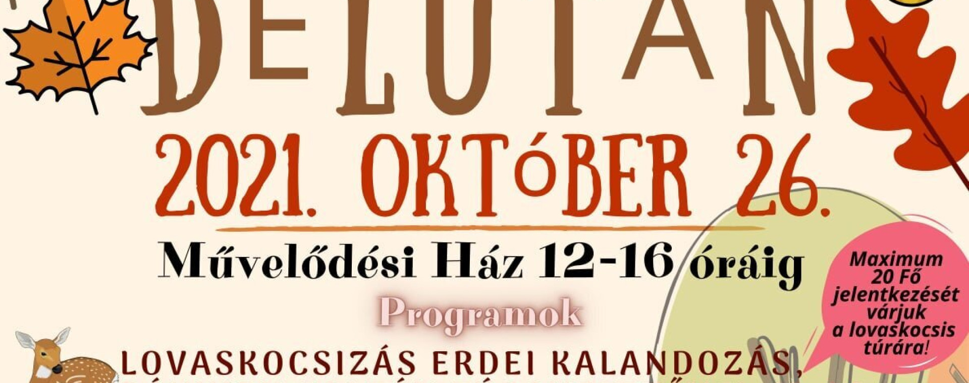 12,30 órától: Lovaskocsizás erdei kalandozás Bánhidy Zoltán túravezetővel. Játékos, tökös feladatok várnak mindenkire az erdőben! Maximum 20 Fő jelentkezését várjuk a lovaskocsizásra