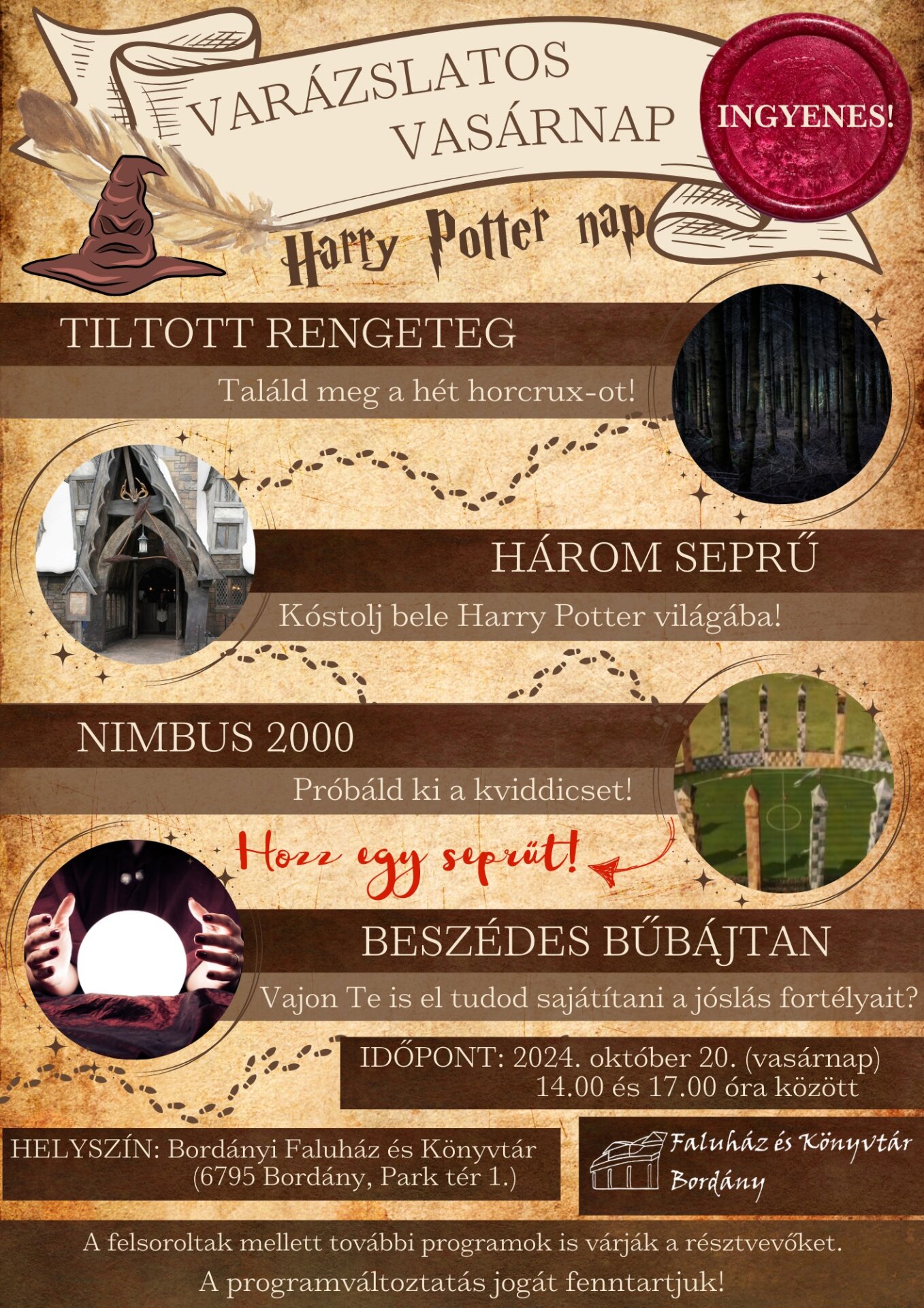 Minden Kedves Harry Potter rajongó figyelmébe ajánljuk a Bordányi Faluházban és Könyvtárban rendezett "Varázslatos Vasárnap" című programot.