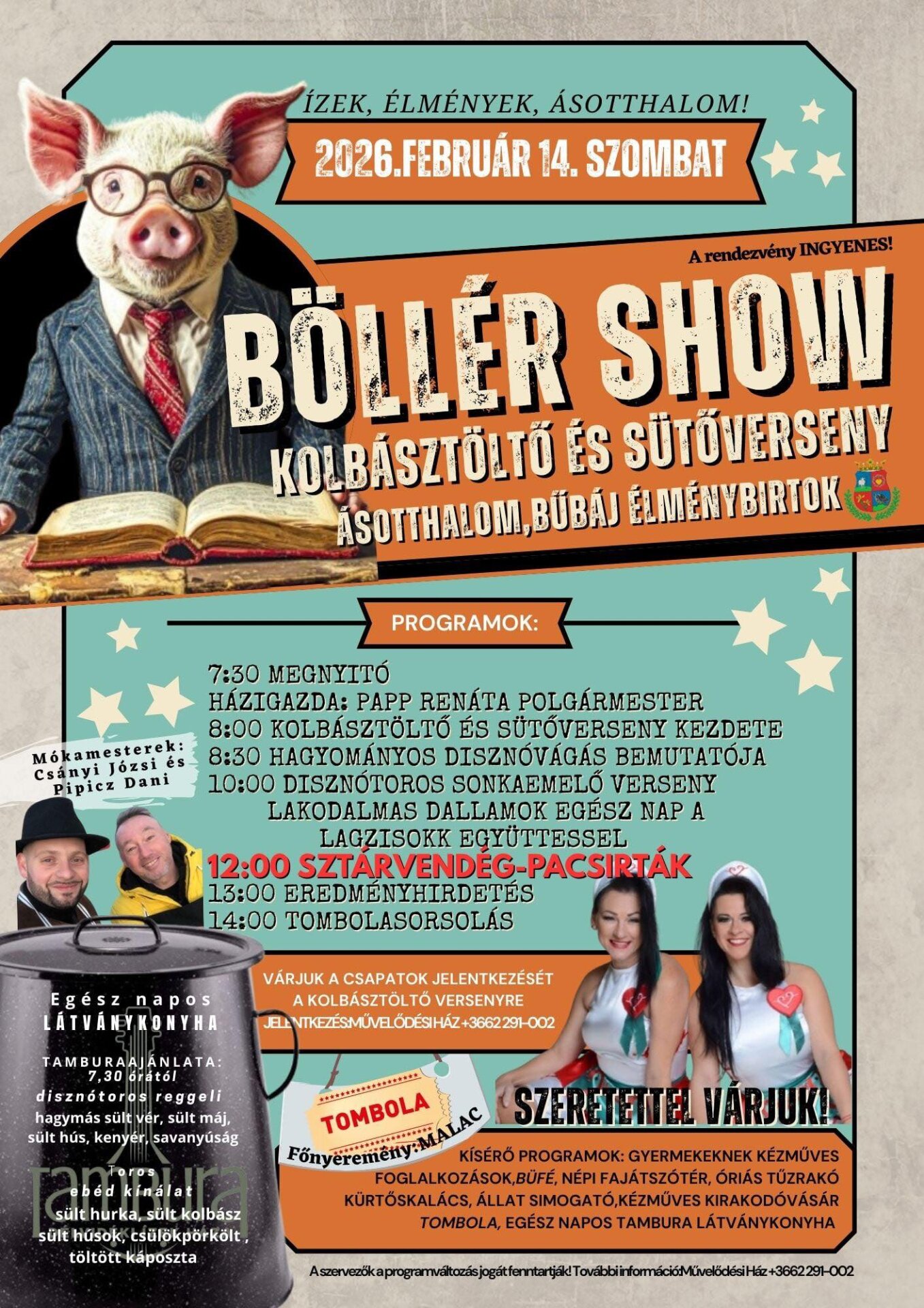 2026.február 14-én szombaton 7:30 órától szeretettel vár minden kedves látogatót az VI. Böllér Show & Kolbásztöltő és sütőversenyre a Bűbáj Élménybirtokon .